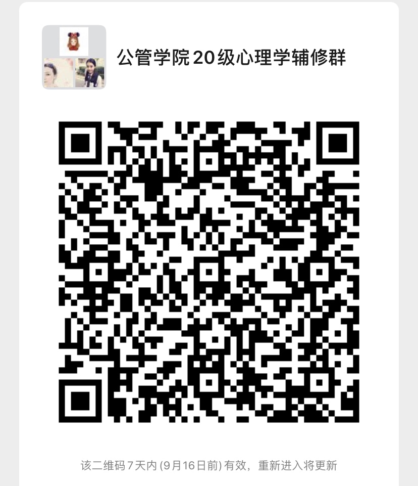2020级应用心理学辅修9月13日开始上课,请拟录取同学根据课表上课(详见附件4)。缴费注册时间另行通知。请拟录取同学扫描以下二维码加入公管学20级辅修群,后续事宜将通过微信群通知:
