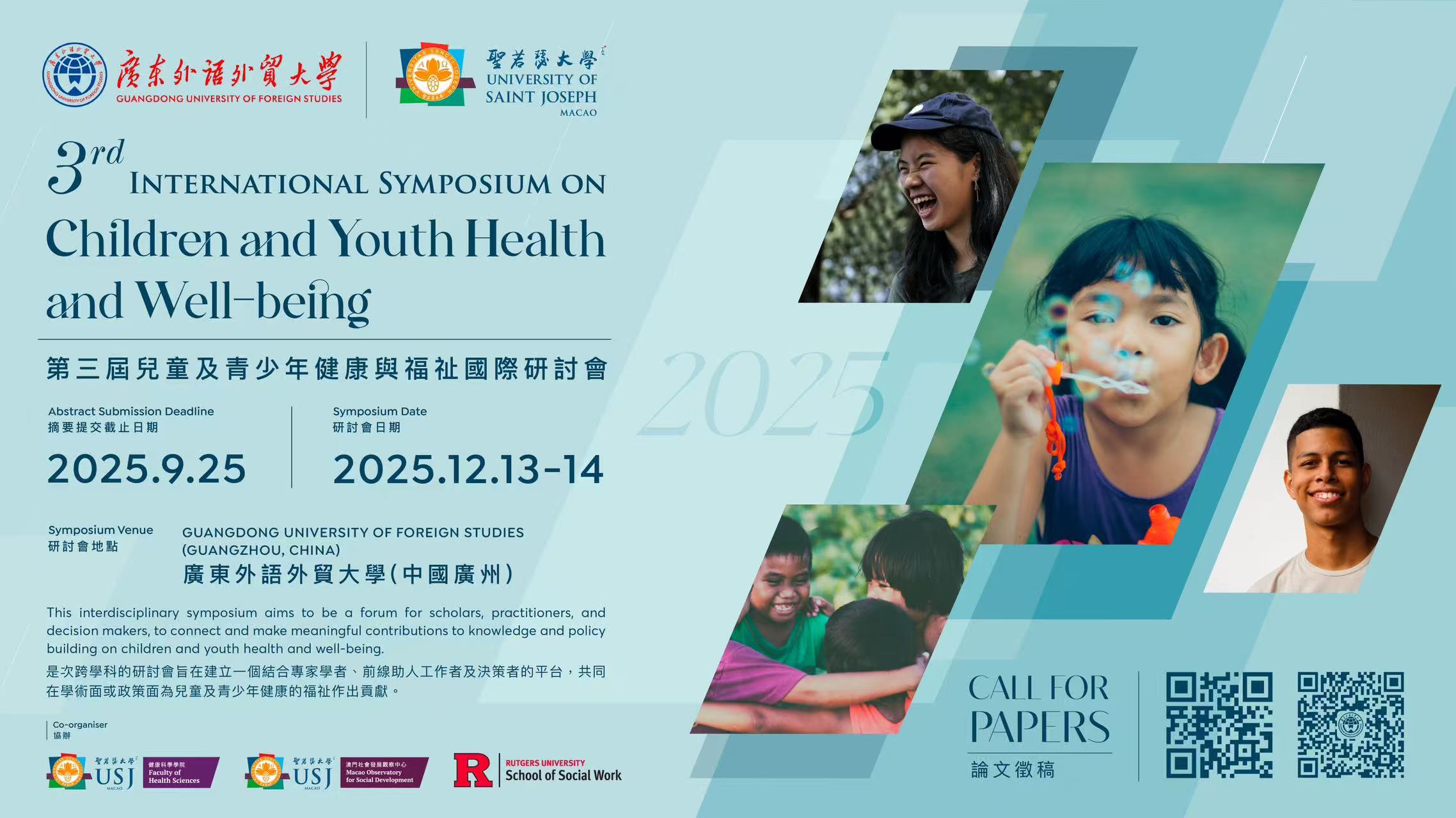 To promote the healthy growth and social integration of children and youth, comprehensively improve their social well-being and health, and effectively address current regional and global challenges facing children and youth protection, the School of Public Administration of Guangdong University of Foreign Studies, the School of Health Sciences of the University of Saint Joseph, and the School of Social Work of Rutgers University will jointly host the "2025 International Symposium on Children and Youth Health and Well-being" in Guangdong University of Foreign Studies(Guangzhou, China), on December 13–14, 2025. This symposium will serve as an interdisciplinary, cross-sectoral, and cross-regional platform for academic exchange and knowledge production, bringing together policymakers, experts, scholars, and practitioners from relevant fields to discuss important issues related to children and youth health and well-being. Experts, scholars, and practitioners from social work, psychology, education, public health, medical science, and other related fields are warmly welcome to submit papers. The call for papers is hereby notified as follows.
