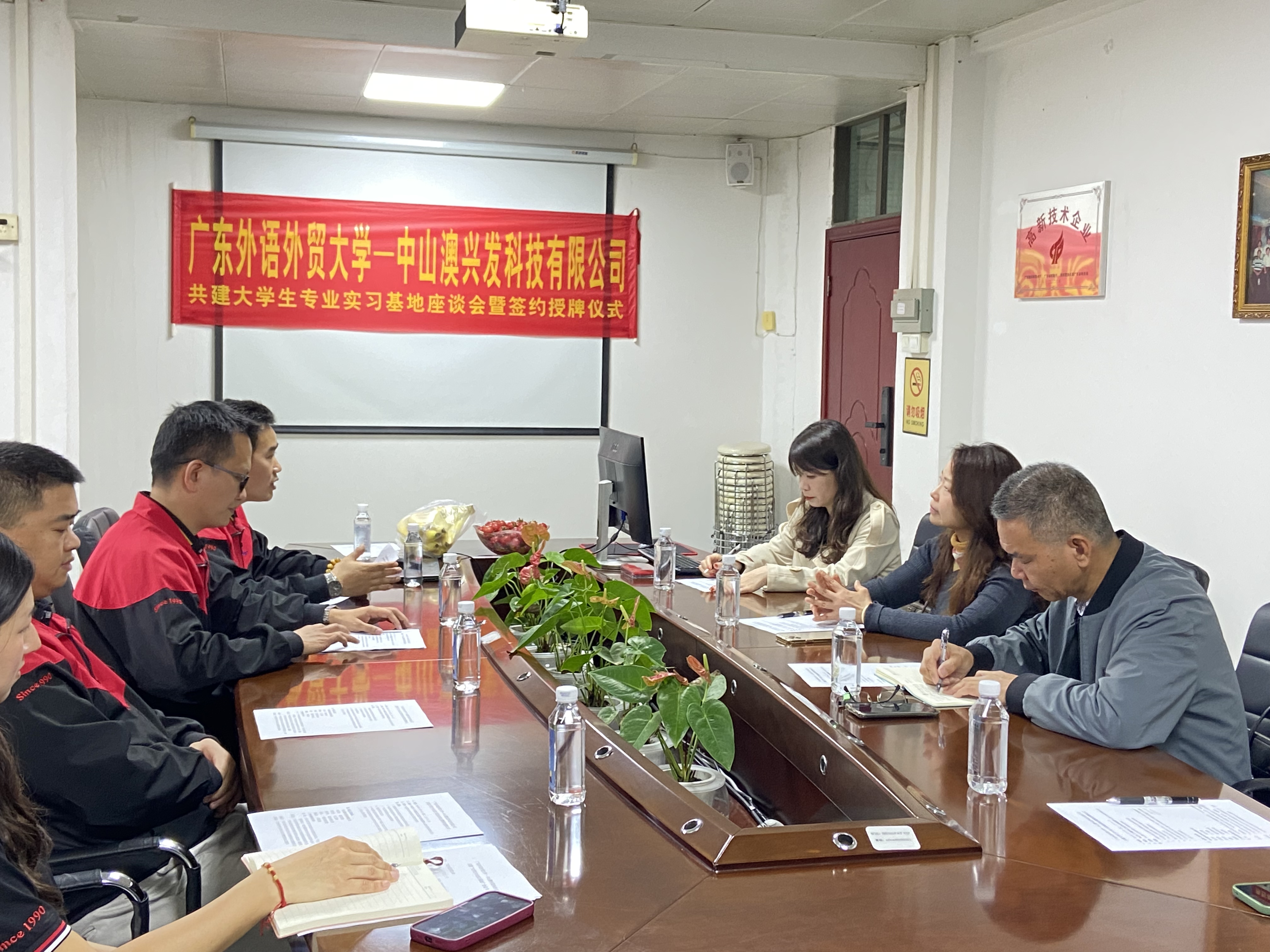 座谈会后,现场举行了广东外语外贸大学与中山澳兴发科技有限公司共建大学生专业实习基地合作签约及授牌仪式,双方共同签署了共建“大学生专业实习基地”协议书,涂斌向余文钦授予实习基地牌匾。