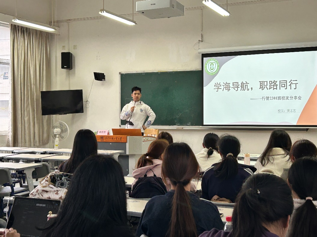为进一步提升学院学子的专业认知和专业自信,提振同学们的学习动力、帮助大一同学合理规划职业发展,充分发挥优秀校友的模范引领作用。2024年3月7日,由公管学院举办主题为职业发展规划与本科学习规划的校友分享会在C205如期举行。2008届优秀校友黄志艺——广州琢选生物科技有限公司总经理为行政管理2301班的同学们分享自身成长、就业经验。