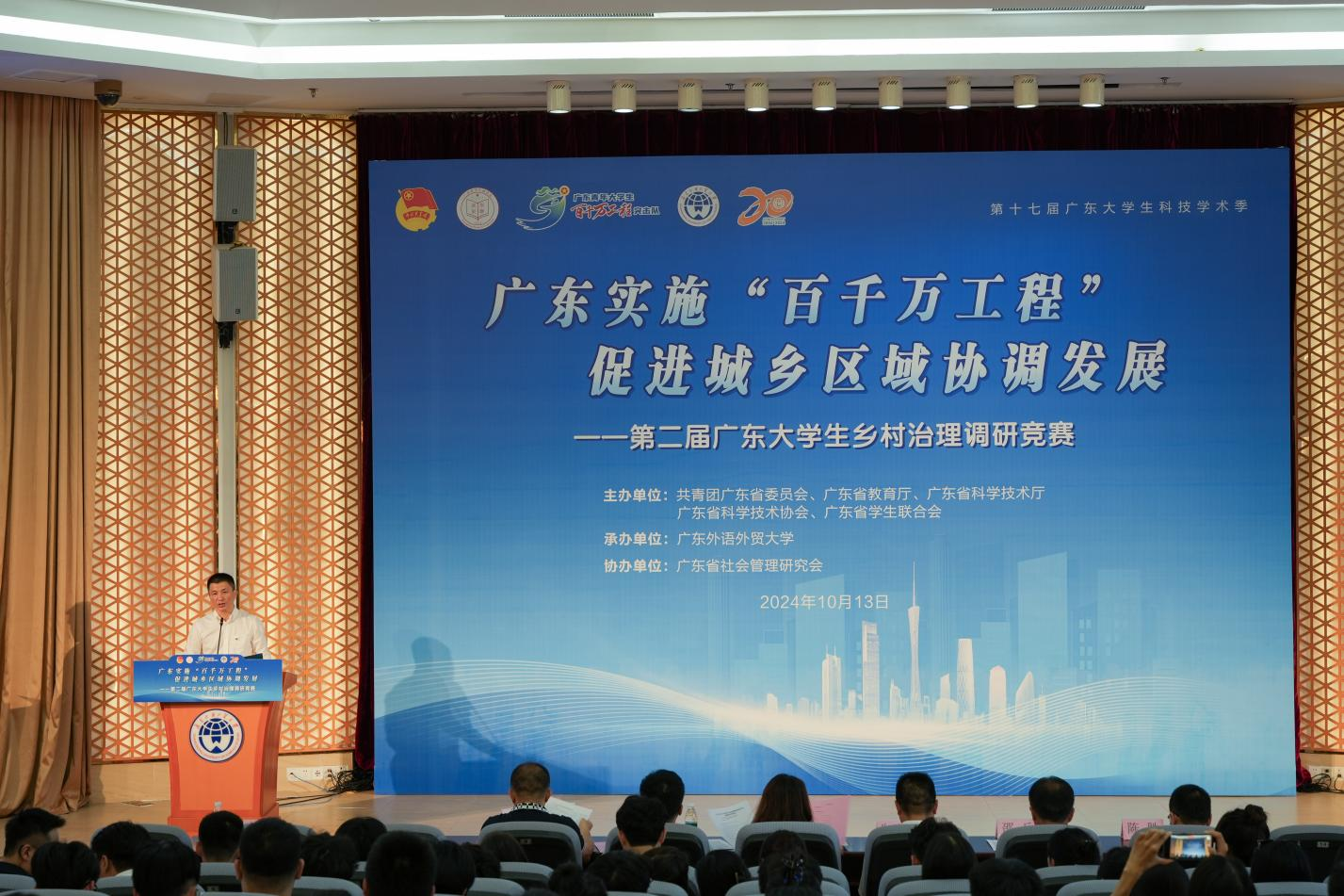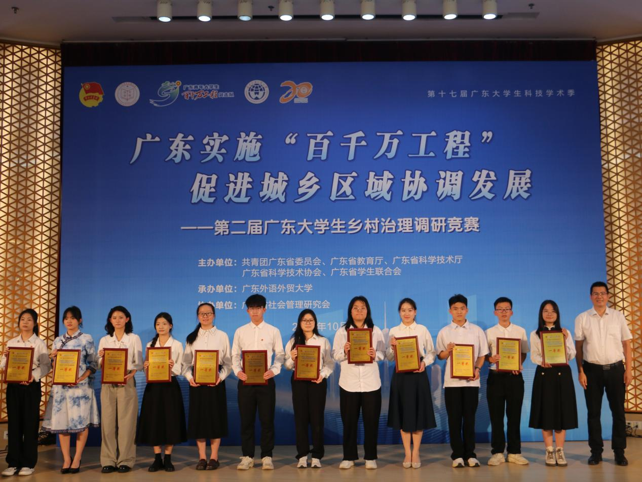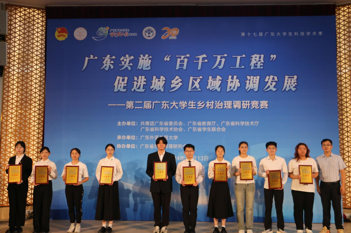 2024年10月13日,第二届广东大学生乡村治理调研竞赛决赛颁奖仪式在我校大学城校区顺利举办。此次大赛由共青团广东省委员会、广东省教育厅、广东省科学技术厅、广东省科学技术协会与广东省学生联合会主办,广东外语外贸大学承办,广东省社会管理研究会协办。我校获一等奖3项,二等奖1项,三等奖3项。
