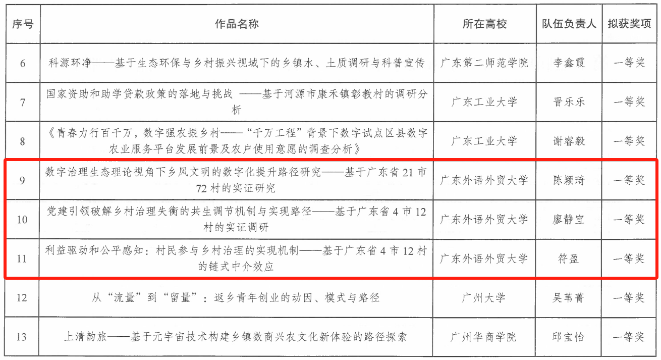 2024年10月13日,第二届广东大学生乡村治理调研竞赛决赛颁奖仪式在我校大学城校区顺利举办。此次大赛由共青团广东省委员会、广东省教育厅、广东省科学技术厅、广东省科学技术协会与广东省学生联合会主办,广东外语外贸大学承办,广东省社会管理研究会协办。我校获一等奖3项,二等奖1项,三等奖3项。其中我院学子在老师的精心指导下,获得大赛一等奖3项。