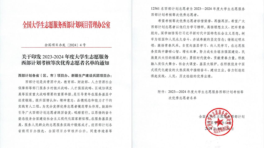 近日,西部计划全国项目办印发了《关于印发2023-2024年度大学生志愿服务西部计划考核等次优秀志愿者名单的通知》,经西部计划各省级项目办推选、全国项目办审核并公示,我校共有8名志愿者获评全国西部计划考核优秀等次志愿者,分别是:经济贸易学院李枚忆、商学院成梦嫣、西方语言文化学院祝婉婷、亚非语言文化学院朱毅晖、法学院叶洁双、国际关系学院黄奕涵、社会与公共管理学院孙丽媛以及信息科学与技术学院高海丽。