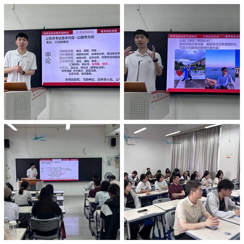 分享会上,曹灿文结合自身备考经历,系统解析了公务员考试的核心内容与备考技巧。他以国考为例,详细介绍了笔试科目“行测”与“申论”的题型特点及学习方法。他还分享了面试经验,强调逻辑表达与应变能力的重要性。