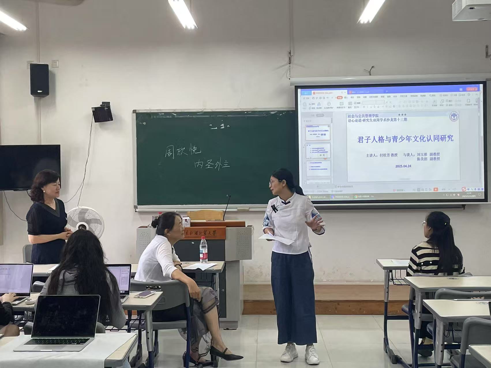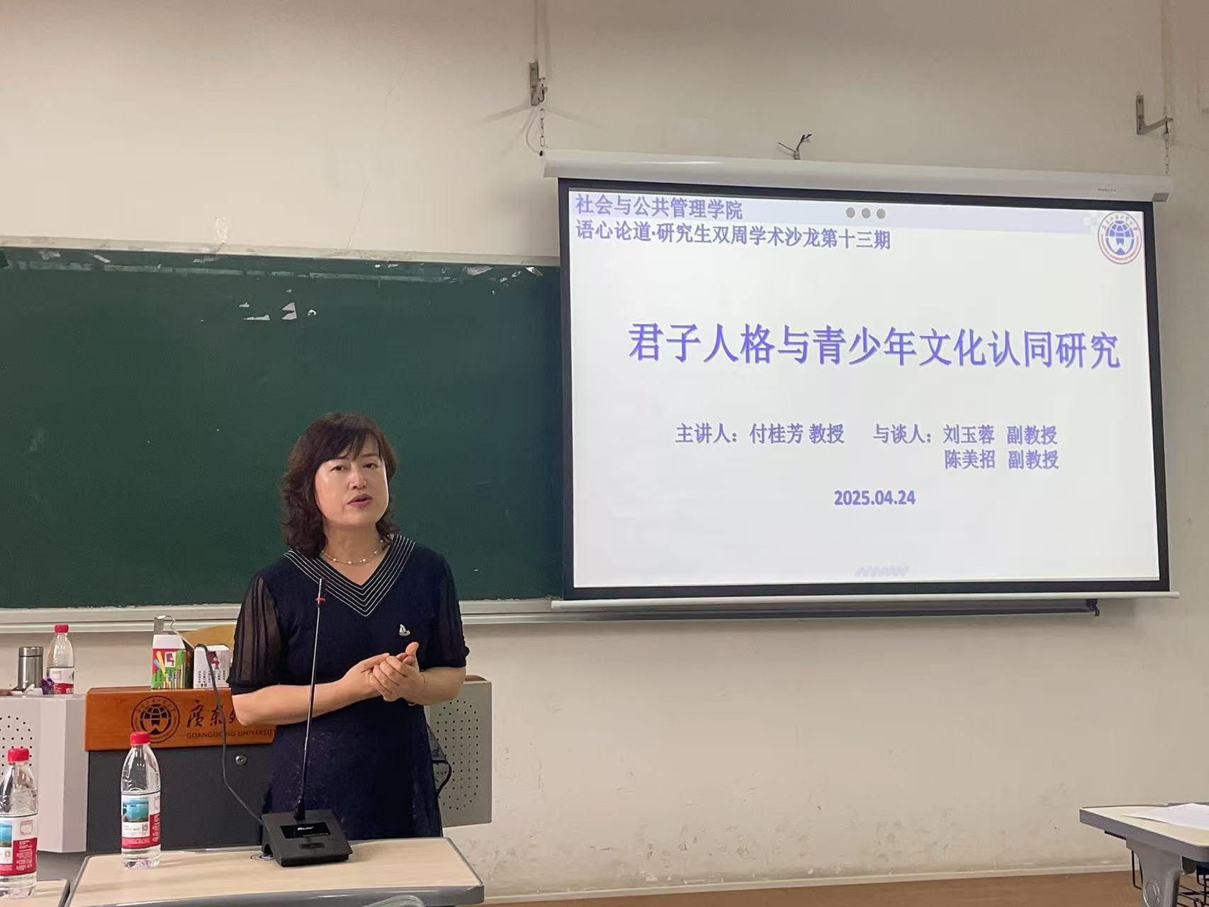 本网讯,广东外语外贸大学社会与公共管理学院于2025年4月24日(周四)在大学城校区C座206教室顺利举办了第十三期“语心论道·研究生双周学术沙龙”。本期沙龙以“君子人格与中华文化认同研究”为主题,由付桂芳教授担任主讲人,刘玉蓉副教授和陈美招副教授担任与谈人,费久浩副院长出席,30余名研究生参与了本次沙龙。