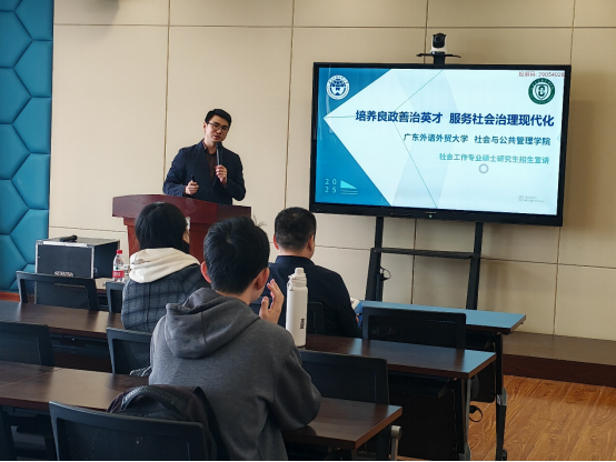 在三场宣讲会上,蔡天老师详细介绍了广东外语外贸大学及社会与公共管理学院的办学历史、学科特色与科研成果,重点围绕“多语种+社会工作”硕士研究生项目的招生计划、课程设置、培养模式及就业方向作了深入解读,着重强调了该项目在国际视野与跨文化社会服务方面的人才培养优势。