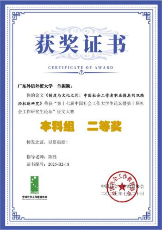 本科组兰振颖撰写的论文《制度与文化之间:中国社会工作者职业倦怠的双路径机制研究》荣获全国二等奖。