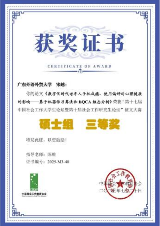 硕士组宋越撰写的论文《数字化时代老年人手机成瘾、使用偏好对心理健康的影响——基于机器学习算法和fsQCA组态分析》荣获全国三等奖。