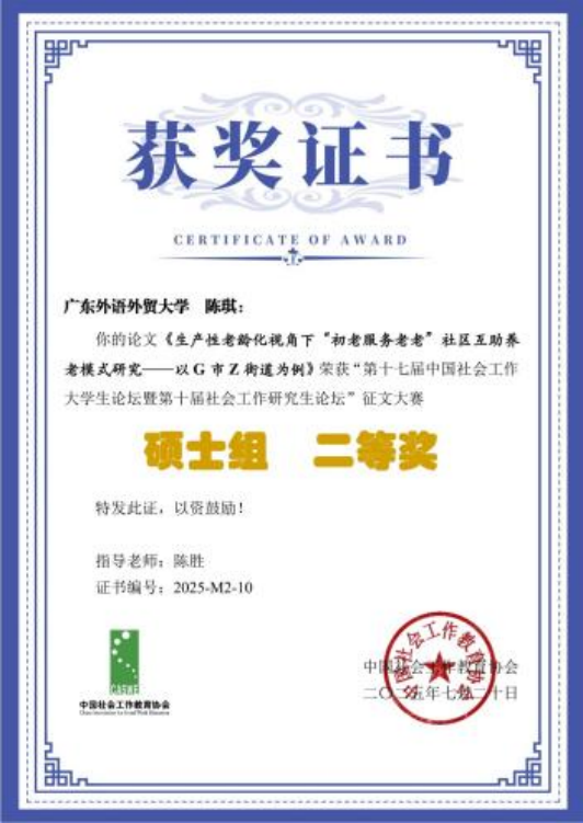 硕士组陈琪撰写的论文《生产性老龄化视角下“初老服务老老”社区互助养老模式研究——以G市Z街道为例》荣获全国二等奖。