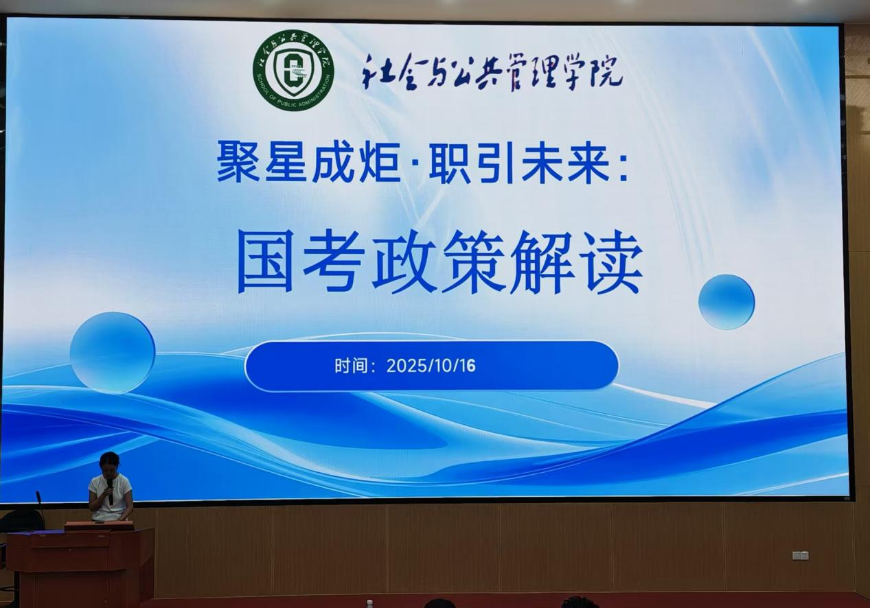 (本网讯) 为助力学生把握2026年国考方向、科学备考选岗,10月16日下午,公管学院在大学城校区MPA中心第一会议室举办国考解读及岗位选报指导专题讲座。广东优公教育金牌讲师梁老师主讲,学院党委副书记刘丽玉、辅导员李佳宁及各年级有考公意向的学生参会。