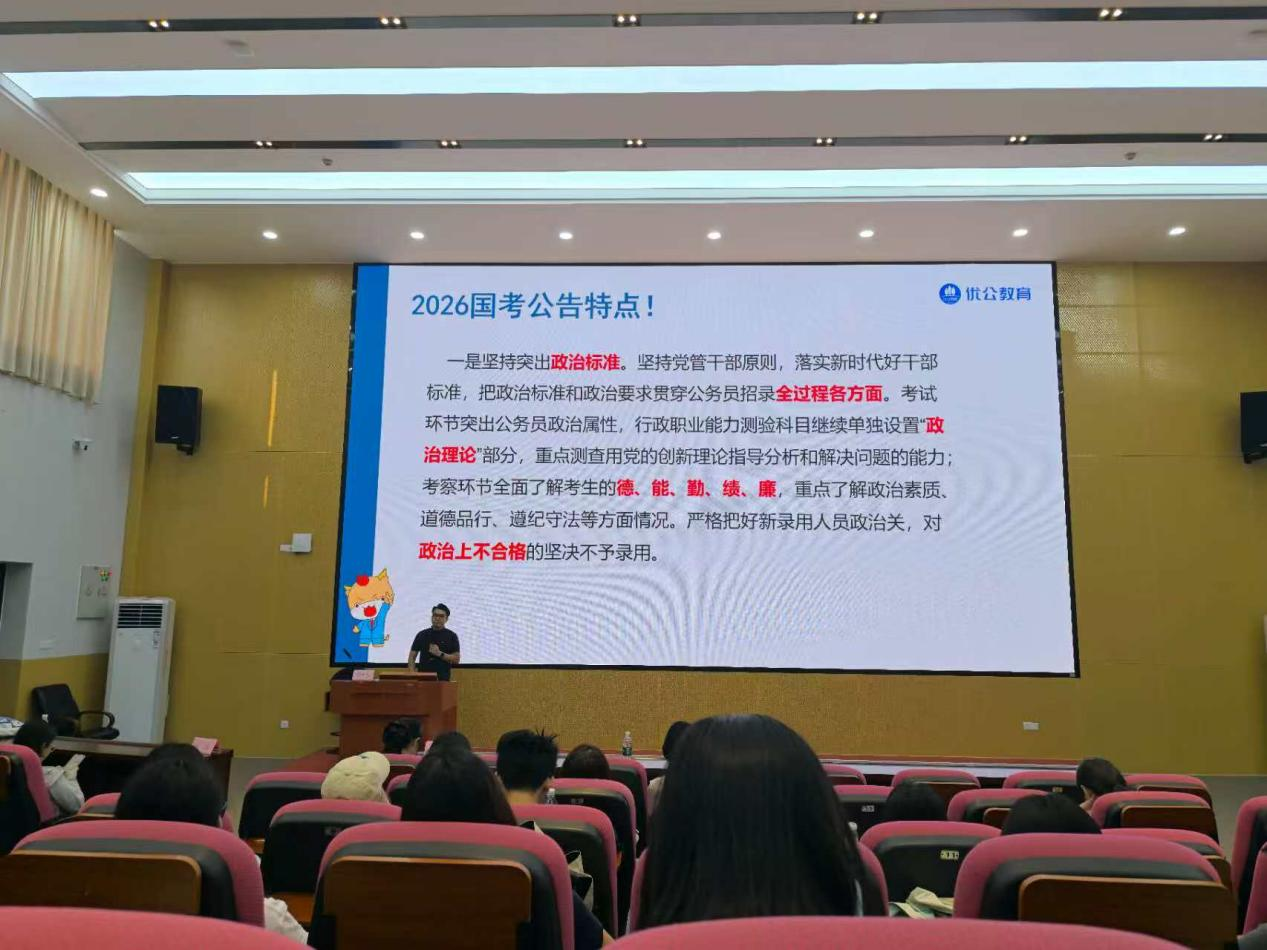 梁老师围绕国考备考与选报搭建了清晰的分享框架。对2026年国考核心政策进行全面梳理,帮助学生把握招录整体方向;随后系统讲解国考关键时间节点,梳理从报名到面试的全流程重点;接着聚焦岗位选报核心环节,分享实用的筛选与决策方法;最后补充笔试备考的重点方向与规划思路,为学生提供全链条指引。