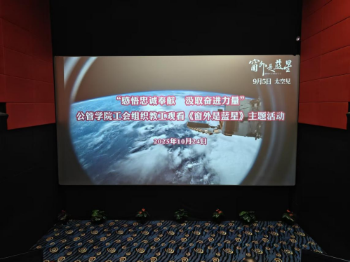 本网讯 为响应大学工会号召,更好地从太空视角直观感受国家发展伟业和新型举国体制的独特优势,从航天英雄身上感悟忠诚奉献、求实创新的崇高品格,从中国航天辉煌成就中汲取奋进力量、提振干事创业的精气神,公管学院组织教职工前往大学城金逸珠江国际影城,观看电影《窗外是蓝星》。