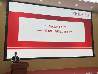 在阐释“什么是学生骨干”时,他给出“看得见、信得过、靠得住”的简洁答案,结合疫情期间参与学校战“疫”的经历,说明学生骨干就是要在关键时刻站出来、顶上去,成为师生间的“连心桥”。而在“怎样当好学生骨干”的核心部分,他提出“思想有根脉、行动有意义、筋骨要强健、团队要会带”的准则:思想上要听党话跟党走,将个人成长与国家战略同频共振;行动上要秉持《士兵突击》“不抛弃、不放弃”的信念,在“问题叠着问题”的学生工作中学会成事;体魄上要以“重复的坚持”锤炼自律,为长远发展筑牢基础;团队中要践行“独行快,众行远”,让团队“聚是一团火,散是满天星”。
