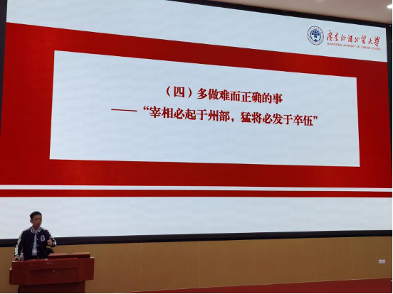讲座伊始,吴宏豪校友以“广外不是985,广外不是211,广外就是广外”的深情感慨拉开序幕。他结合自身在广外的求学经历,分享了当年参与“三下乡”暑期社会实践、政管学院调研大赛、第105届广交会实践等珍贵往事,一张张老照片、一段段奋斗历程,不仅勾勒出他在广外从青涩学子到成熟骨干的成长轨迹,更饱含着对母校培育、学院关怀的感恩之情。“正是在公管学院的土壤里,我学会了如何在学生工作中扛责任、解难题。”吴宏豪校友言语间满是对母校的眷恋,他亲切热情的分享风格、谦虚稳重的言谈举止,迅速拉近了与现场学生的距离,不少学生边听边记录,现场不时响起共鸣的掌声。