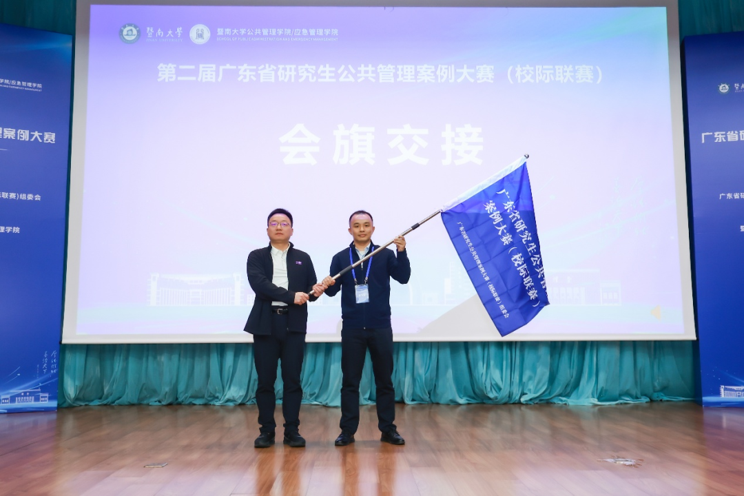 我院将承办第三届广东省研究生公共管理案例大赛。在当天的会旗交接仪式上,费久浩副院长从暨南大学公共管理学院/应急管理学院副院长唐攀教授手中接过赛事旗帜,并对第二届赛事承办方的精心组织表达赞赏和感谢,认为公共管理案例大赛是中国公共管理自主知识体系建设的重要组成部分,充分彰显了广东MPA共同体在治国理政与学术体系建构中的担当和水平,最后他诚挚邀请各MPA兄弟单位明年齐聚广外,共同推动公共管理案例大赛的高质量发展。