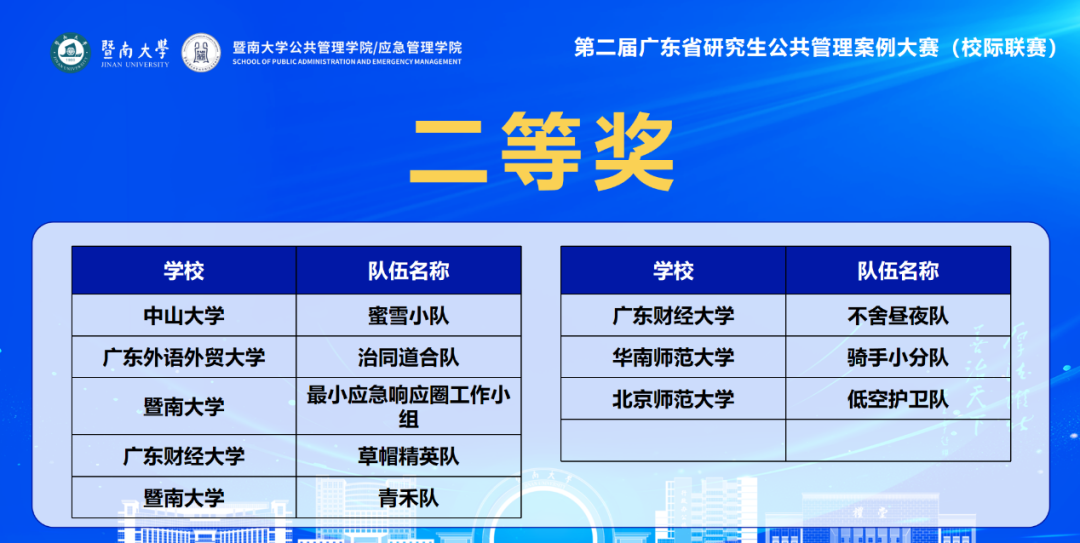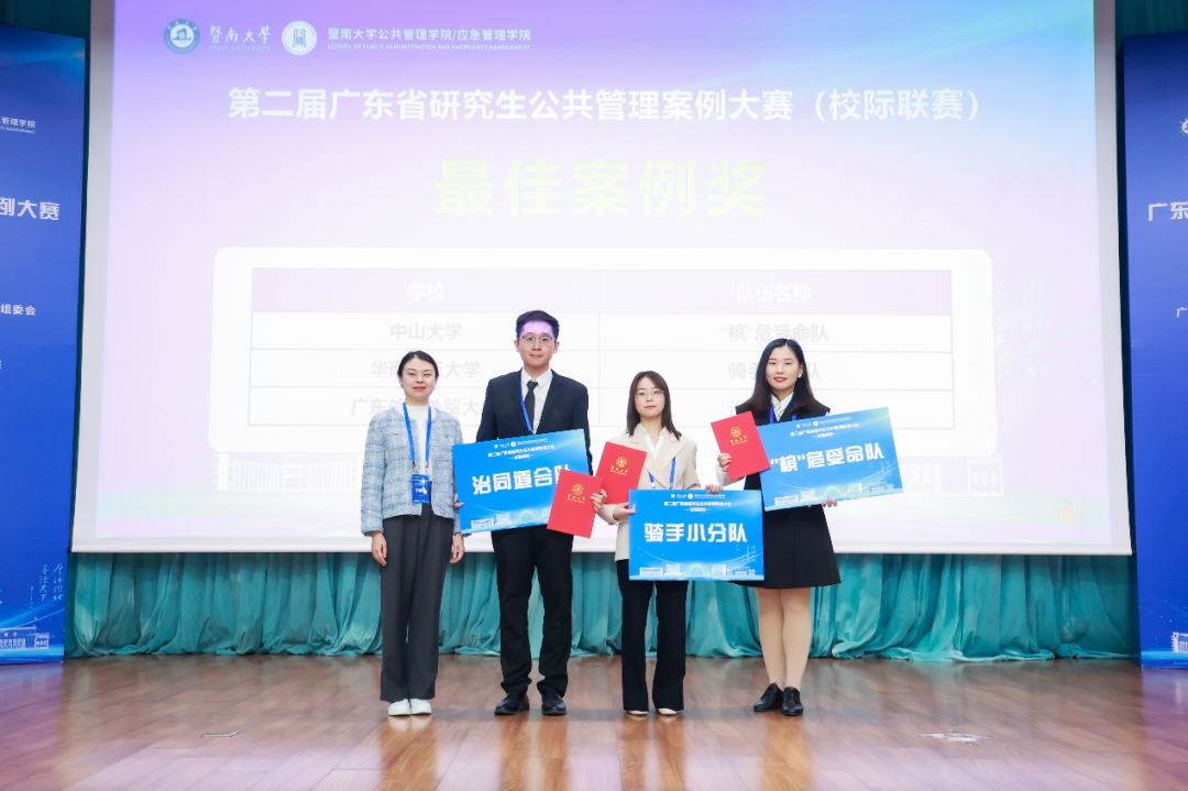 公管学院MPA教育中心通过广泛动员和积极准备,共组织师生提交了10个参赛案例,涂斌教授和张健培老师指导的队伍“治同道合队”(队长:王梓旭,队员:程志芳、蓝原辉、曾钧)成功闯入决赛,并荣获二等奖和最佳案例奖,两位指导老师获评“最佳指导教师”,我单位荣获优秀组织单位奖。