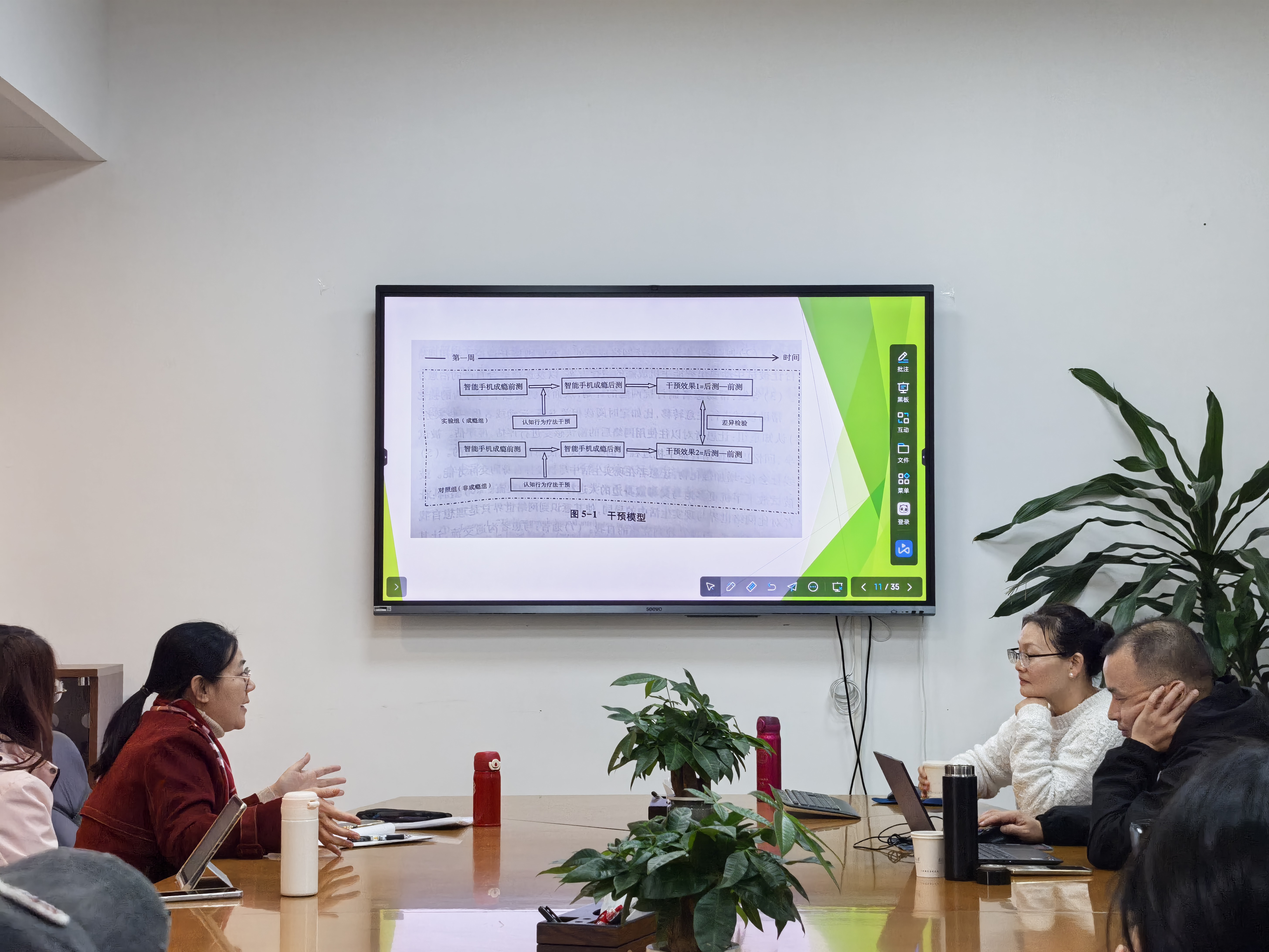 本网讯 我院于2025年12月26日早上在学院楼D506开展了第二十五期研究生双周学术沙龙,主题为“手机成瘾的干预研究进展”。本次沙龙主讲人为吴艳教授,与谈人为费久浩副院长、柳玉臻副教授。此次沙龙约有40名研究生现场参加。