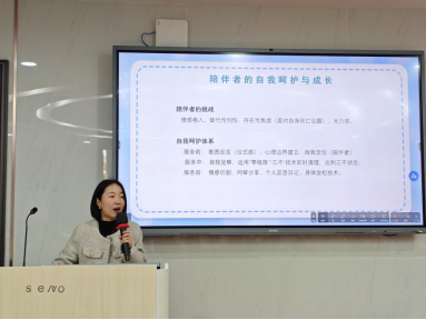 首先,卢老师介绍了心灵呵护的基本理论。安宁疗护是指以终末期患者和家属为中心,以多学科协作模式进行实践,为患者提供身体、心理、精神等方面的照料和人文关怀等服务,控制患者的痛苦和不适症状,提高生命质量,帮助患者舒适、安详、有尊严地离世,最终达到逝者安详,生者安宁,生死两相安的目的。随后卢老师详细介绍了心灵呵护的核心体系,以“爱与陪伴”为核心,遵循“不分析、不评判、不下定义”的原则,依据同频共振原理,通过爱与陪伴方法及心灵呵护技术的应用,陪伴老人面对死亡的孤独、恐惧或纠结。此外,卢老师还分享了临终老人的身心特点和核心需求,并通过实践案例和视频,让大家更加直观地感受到了爱与陪伴的力量。