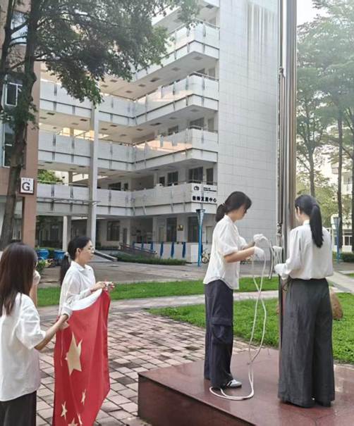 本网讯 为厚植爱国主义情怀,强化青年使命担当。2026年4月20日,公管学院于大学城校区教学楼中庭和行政楼举行升旗仪式,共计4名旗手负责本次活动。学院团学组织部负责人李怡萱与60余名学生代表出席本次升旗仪式。