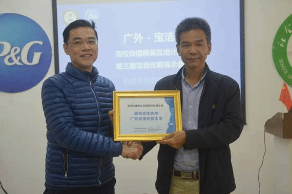 在许有杰先生致辞之后,他代表宝洁公司向广东外语外贸大学颁发最佳项目伙伴证书,高云坚书记代表广东外语外贸大学公管学院接受证书。