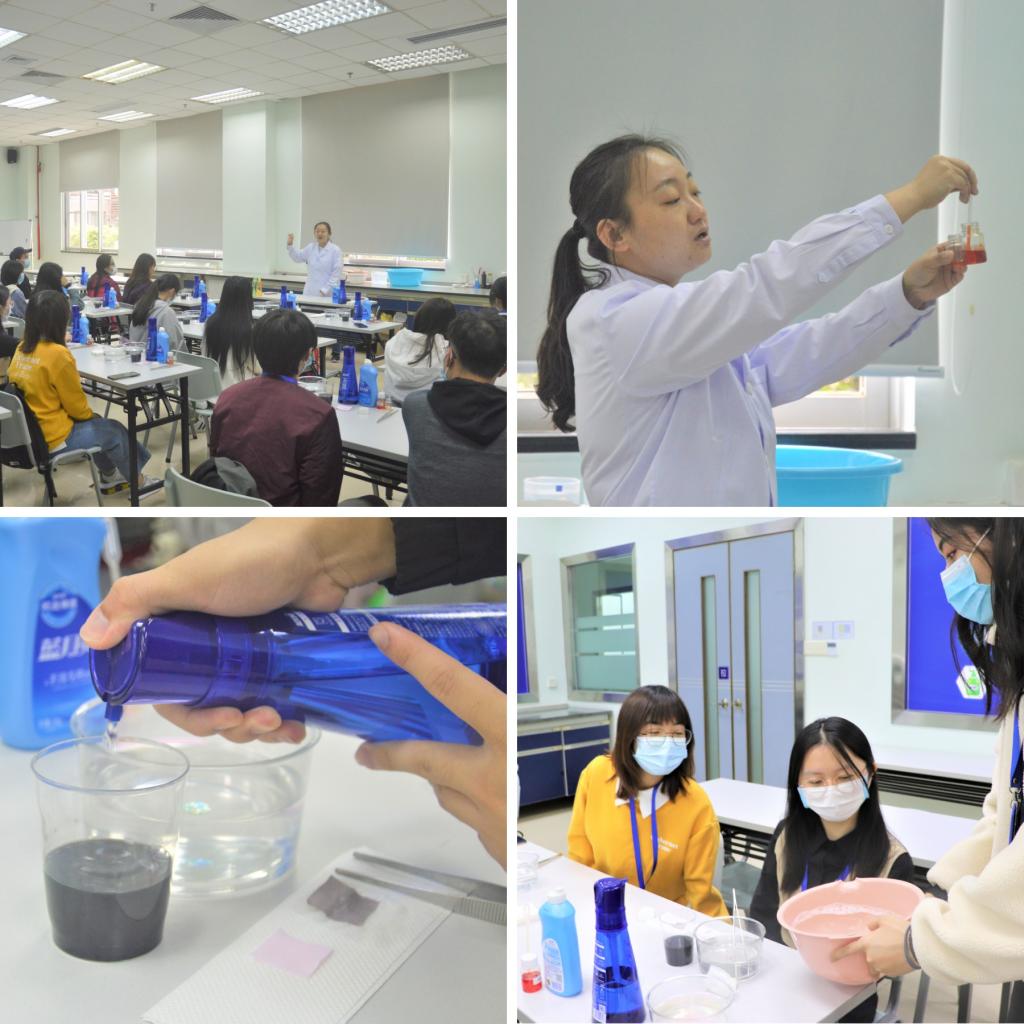 随后,同学们来到了蓝月亮公司的实验室,在专业人士的讲解与指导下,进行了干衣预涂、灰衣洗涤以及用洗洁精清洗果蔬这三个有趣的科学实验。在动手实践的过程中,同学们惊叹于化学反应在衣物布料上的一系列变化,被其深深吸引,大家都深入感受到了蓝月亮产品以及多种洗衣方式的奇妙之处,每一位同学也都在实操中真切体会和领悟化学的奥妙,了解与学习科学的原理。