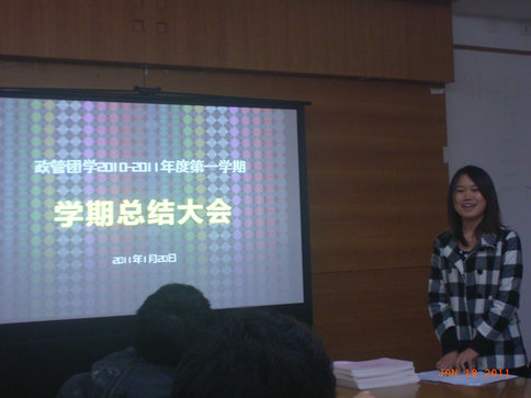 1月20日晚6点半,政管团学2010-2011年度第一学期总结大会在院系办公楼426室召开。参与本次大会的有:我院新任党委副书记邵兵、团委书记梁玲华、10级辅导员陈少博、团学主席团、各部门部长和部分团学干事,以及09级和10级的班长等。大会由学生会主席包莹莹主持。