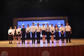 各位新老生代表发言之后,学院领导班子成员为新生代表庄重地佩戴上学校的校徽,在宣告他们成为正式的广外学生之际,也教诲新生谨记“明德尚行,学贯中西”的校训。