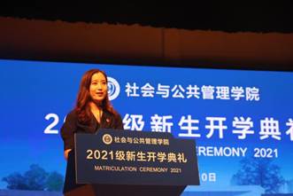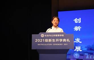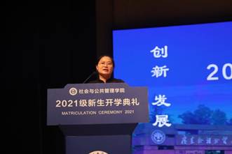 学院硕士生导师刘春燕教授作为教师代表,表达了对全体新生的祝贺和热切地期待。她希望同学们能够尽快适应大学环境以及生活与学习节奏,拿出直挂云帆济沧海的勇气,从零开始不断的解锁技能,迎接人生风雨的洗礼,最终实现理想。