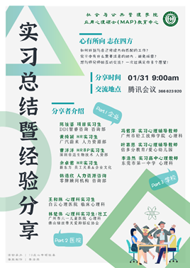 本网讯 2021年1月31日上午,由我院MAP教育中心主办的“2019级MAP实习分享会”以线上形式如期举行。本次分享交流会由我院副院长张信勇和MAP教育中心主任王俊静联合主持,高云坚书记、徐盈艳主任、阎茹老师、杨安老师和郭晶晶老师参与指导,由10名分别来自企业、医院和学校实习组的同学依次进行分享、交流。学院心理学专业本科和硕士研究生也参加了此次分享会。