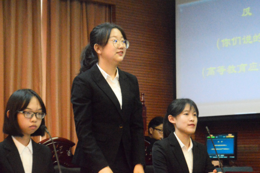 稍事休息之后,“公管杯”冠军赛正式开始,本场比赛的学生评委为谭宝莹,梁健聪,杨钰涵。正反双方就高等教育进出门槛问题进行了激烈的辩论。正方为公管1801班龙吟队,她们认为高等教育应该宽进严出。反方为公管1803班你们说的都不队,他们认为高等教育应该严进宽出。正方从宽进严出对社会公平的促进和高等教育的普及方面的作用阐释了本方的观点,反方则从大学生全面发展角度证明严进宽出的必要性。双方在这没有硝烟的战场上高谈剧论,纵横捭阖,一次次地将比赛推向高潮。在辩论赛和观众提问环节的结束后,学生评委梁健聪对本场比赛进行了清晰明了的总结,并高度赞扬了本场比赛双方辩手的表现。接下来主席罗杰豪正式宣布本场比赛最佳辩手为正方二辩张馨月,亚军为正方公管1801班龙吟队,冠军为反方公管1803班你们说的都不队。随后由高云坚书记为各队伍颁奖。