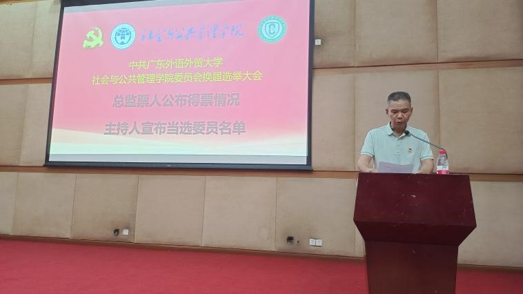 学院党委副书记陈哲同志宣读《中共广东外语外贸大学社会与公共管理学院委员会委员选举办法(草案)》。表决通过选举办法(草案),全体通过总监票人、监票人建议名单。