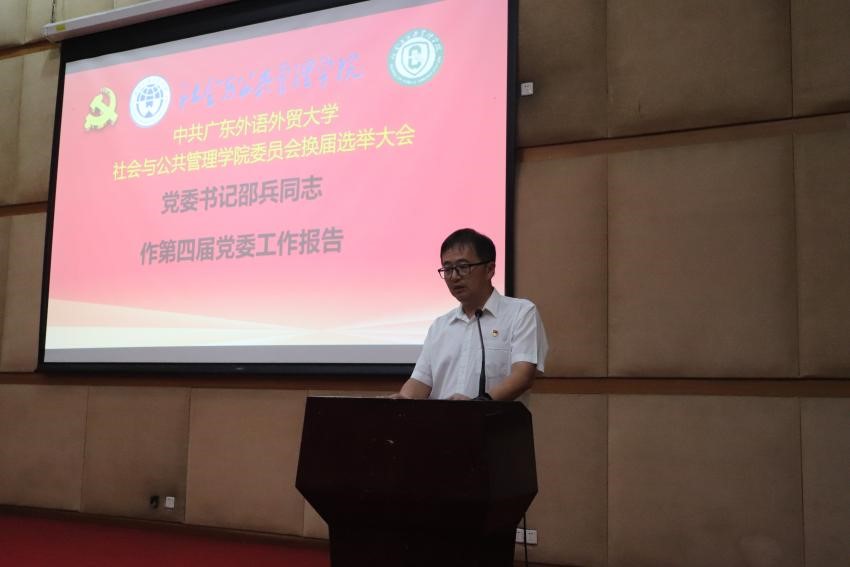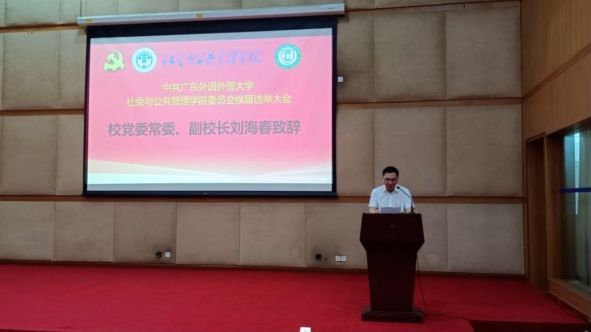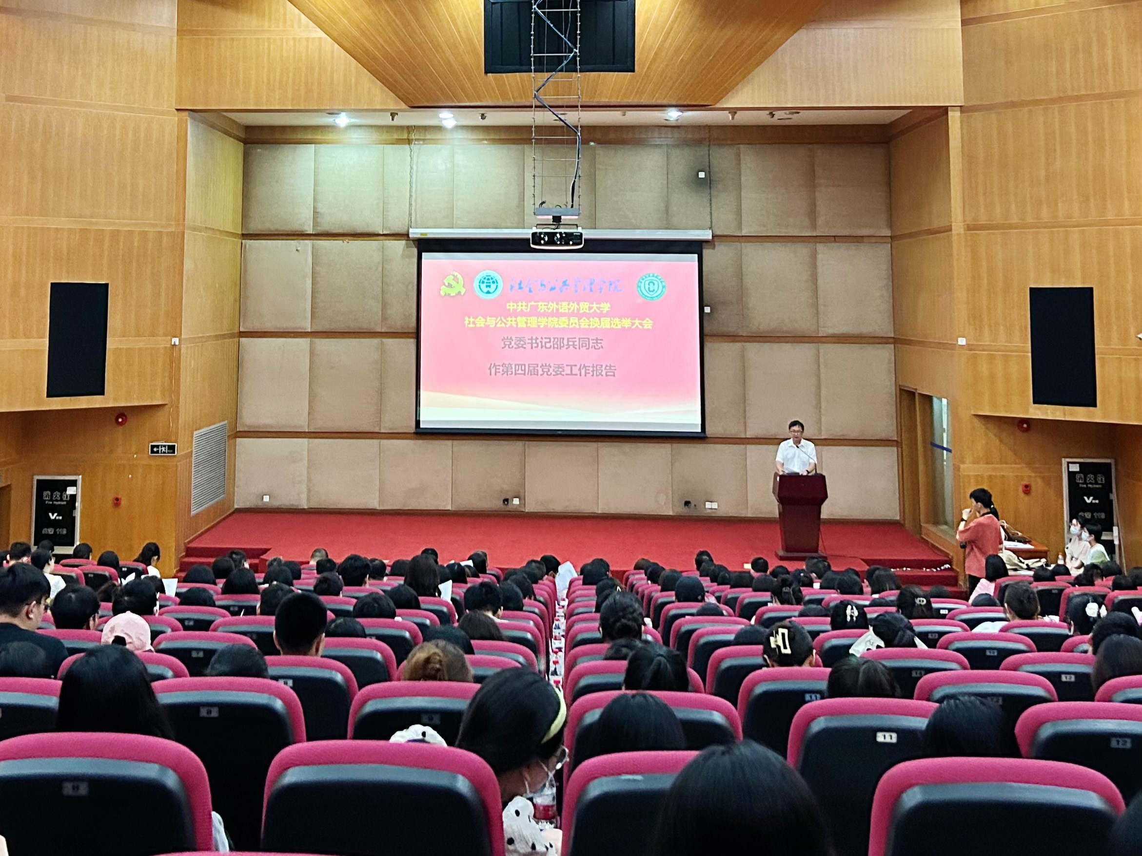 2023年5月25日下午,中共广东外语外贸大学社会与公共管理学院委员会换届选举大会在大学城校区图书馆报告厅隆重举行。校党委常委、副校长刘海春及公管学院全体党员参加会议。大会由学院党委副书记陈哲主持。