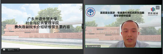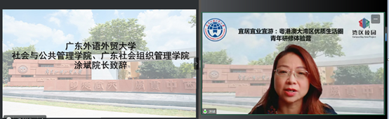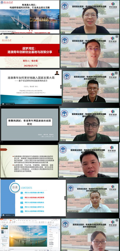 本网讯 2023年6月26日至29日,为期4天的“宜居宜业宜游:‘粤港澳大湾区优质生活圈’青年研修体验营”顺利举行。此次青年研修体验营获2023年教育部“万人计划”立项资助,由国际交流合作部、港澳台事务工作部主管,社会与公共管理学院承办,来自香港大学、香港中文大学、岭南大学、香港浸会大学、澳门大学、澳门理工大学、广东外语外贸大学的青年学子共聚云端,共同参加了此次研修体验营。