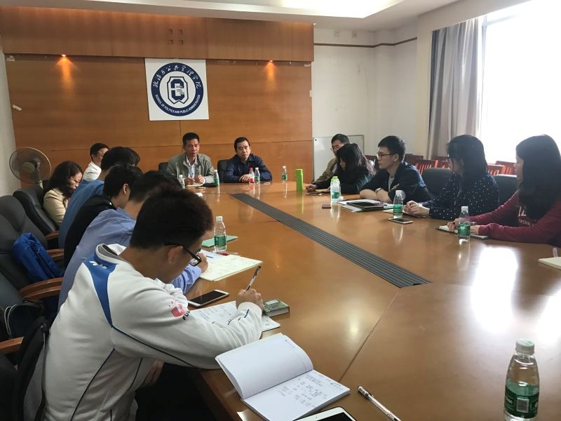 2017年3月6日,政治与公共管理学院在会议室隆重召开2017年研究生就业创业促进座谈会。本次会议的主要内容是对毕业班研究生同学进行择业、就业方面的指导,帮助他们解决求职过程遇到的困难,对求职过程中的应试部分进行答疑。政管学院对此次会议非常重视,院长彭未名、党委书记高云坚、党委副书记邵兵、副院长毛国民、副院长付桂芳参加会议,出席会议的还有广东省社会组织研究中心副主任涂斌教授、校学工处杜雯老师、学院辅导员、办公室老师以及15、16级研究生。会议由院长彭未名主持。