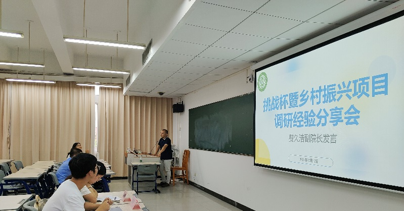 会议伊始,费久浩副院长以挑战杯赛事简介为引,以乡村振兴研究的意义为切入点,勉励同学们能在大学生活中运用专业知识积极参与社会实践,以实践之力助推个人发展、乡村振兴。他也期待同学们能在接下来两位优秀调研队伍代表的分享中有所收获,能够对于项目调研有更深入的了解,为更好投身于同类学术赛事做更充分的准备。