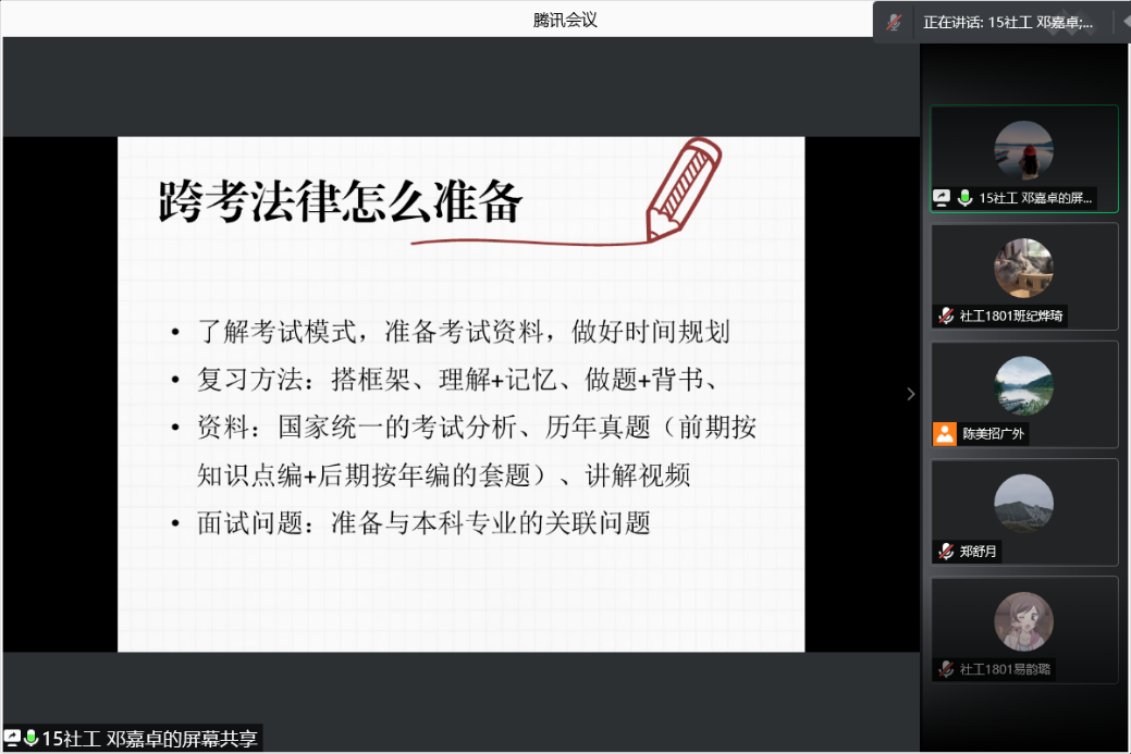 随后,往届考研成功的同学进行考研经验分享与交流。首先进行跨专业考研分享,分享者为2015级考取中山大学法律(非法学)硕士邓嘉卓。邓嘉卓表示跨专业考研的难度在于零基础、竞争大,需要同学们投入更多的时间以及进行更多的前期了解。对于跨专业的选择,则需要以经验为主,进行谨慎选择,如法学以文科专业(法律、心理学)为主。同时,对专业的选择需要多元考虑,以兴趣为主,加之对未来的职业规划及对自身能力的预判难易度。邓嘉卓从搭框架、理解加记忆及做题加背书的复习方法进行经验分享:备考资料以真题为主,结合讲解视频不断进行知识体系的查漏补缺。在备考阶段,则需要做好时间规划,适当休息保证学习效率。且前人的经验同样重要,在备考阶段可以积极寻找学长学姐的帮助,减少寻找资料的时间。最后,邓嘉卓进行了跨专业考取法律硕士的详细经验分享,包括跨专业考研的资料准备、复习方法及备考心态的建设等。