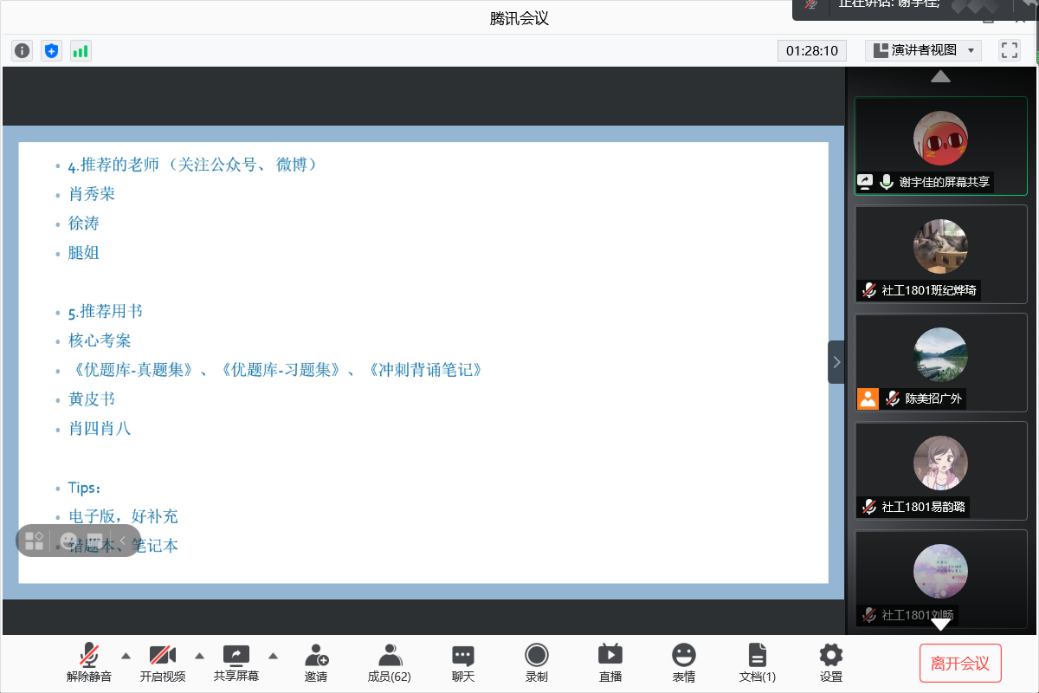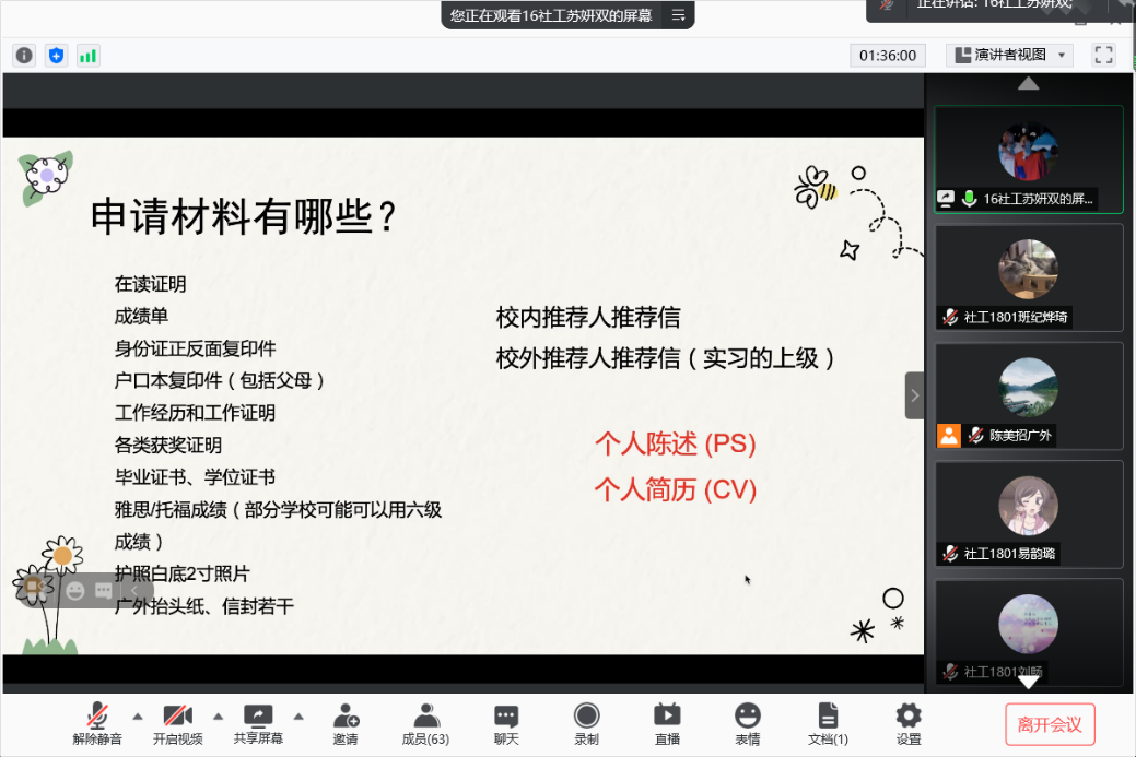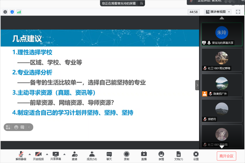 2021年7月5日上午,社会与公共管理学院社会工作专业举办了线上考研分享与动员会。出席本次考研分享与动员会的嘉宾有社会工作系全体老师、2015级考取中山大学法律(非法学)硕士邓嘉卓、2009级考取复旦大学社会工作硕士曾朱玲、2012级考取广东外语外贸大学社会管理硕士陈成才、2017级考取深圳大学心理学硕士谢宇佳、2016级考取香港大学非营利管理硕士苏妍双和全体2018级、2019级、2020级社工专业的学生。