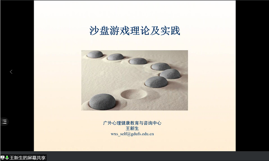 2021年7月9日下午,由社会与公共管理学院应用心理学系心理与行为健康研究中心和MAP教育中心联合举办的“沙盘治疗讲座”以线上形式举行,广东外语外贸大学心理健康教育与咨询中心的专职咨询师王新生为主讲人。应用心理学系主任王俊静老师为讲座主持人,应用心理专业全体研究生与本科生参加了此次讲座。