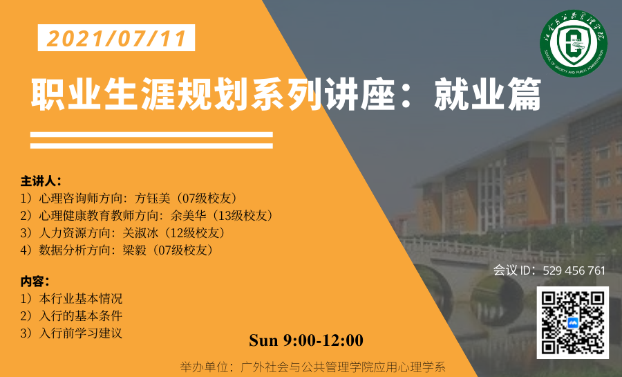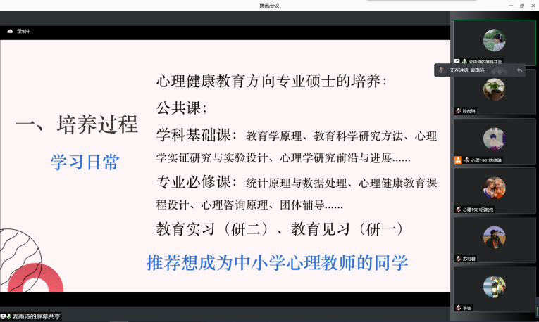2021年7月11日上午9点,社会与公共管理学院应用心理学系师生通过腾讯会议召开了应用心理学系职业生涯规划系列讲座(三):就业篇。会议由学生代表应用心理学2018级戴琦昕主持。公管学院张信勇副院长、应用心理学专业全体研究生和本科学生参加了此次讲座。