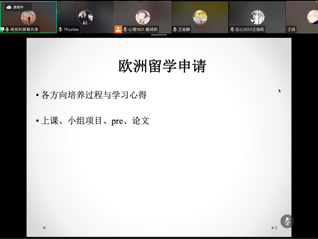 2021年7月7日下午14点,社会与公共管理学院应用心理学系通过腾讯会议开展了职业生涯规划系列讲座(一):出国(境)留学篇讲座。主讲人为应用心理学系毕爽老师、杨安老师和刘方松老师。会议由应用心理学2001班陈雨桐主持,心理学系全体本科生和研究生参加了此次讲座。