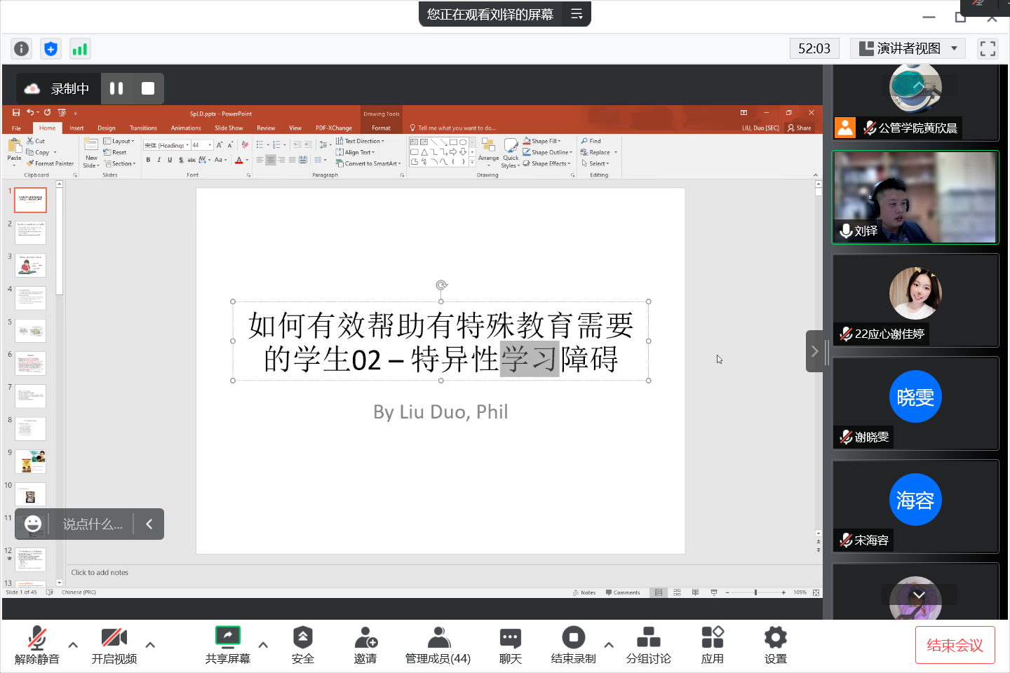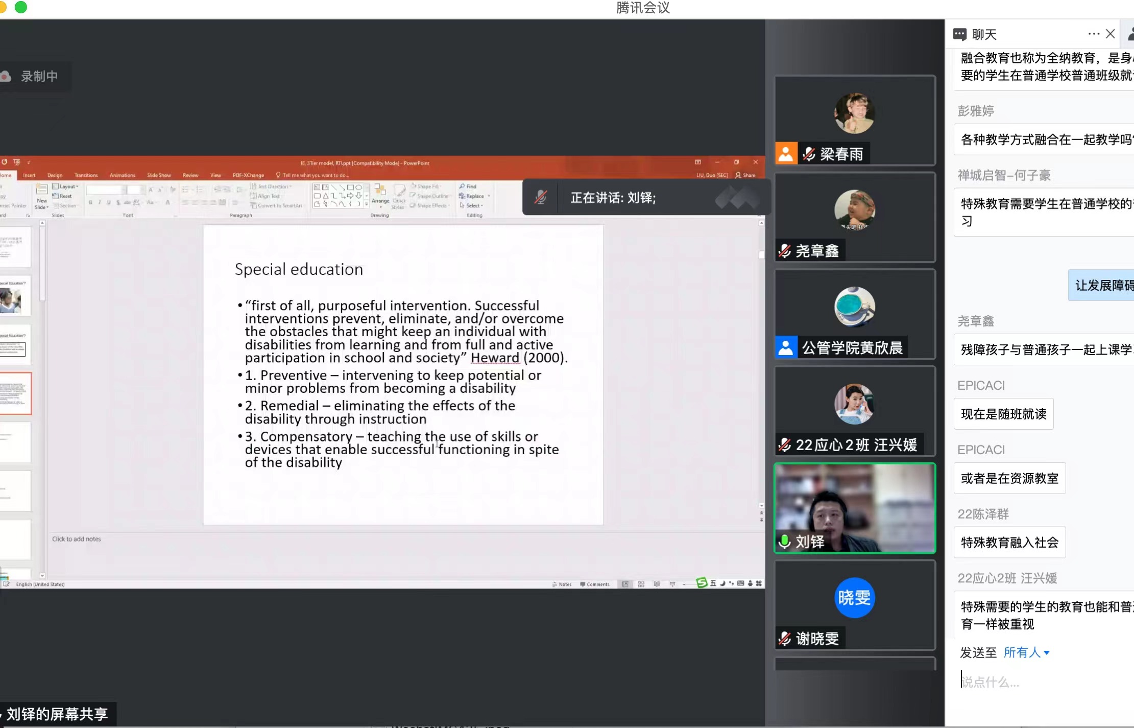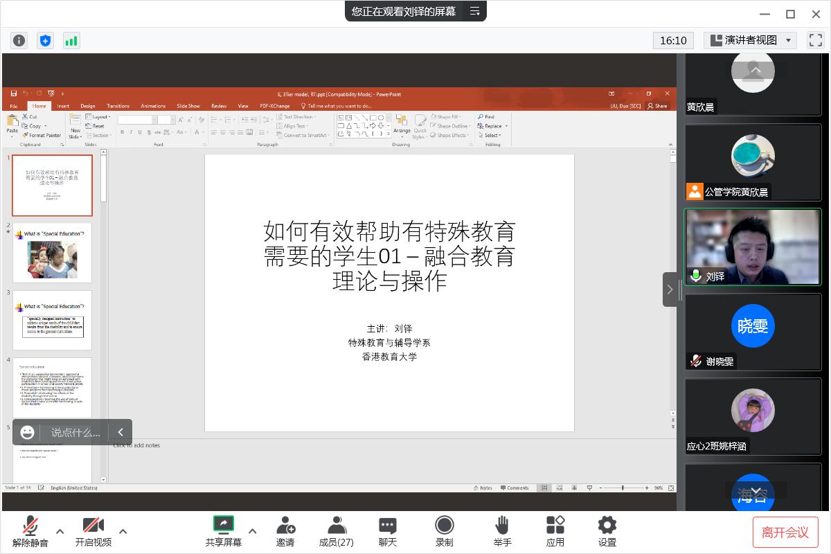 讲座中,刘铎副教授从特殊教育是什么、特殊教育的核心理念、特殊教育的范围(什么学生需要接受特殊教育)和特殊教育的实操等方面对特殊教育进行了详细讲述。过程中,刘铎副教授在各环节穿插了许多相关的研究和见闻,还与同学们开展了“是否支持融合教育”的相关讨论,同学们纷纷给出了自己的看法。参会的老师和同学们都沉浸其中,师生们对特殊教育有了更为精准的理解,明白了开展特殊教育的意义。