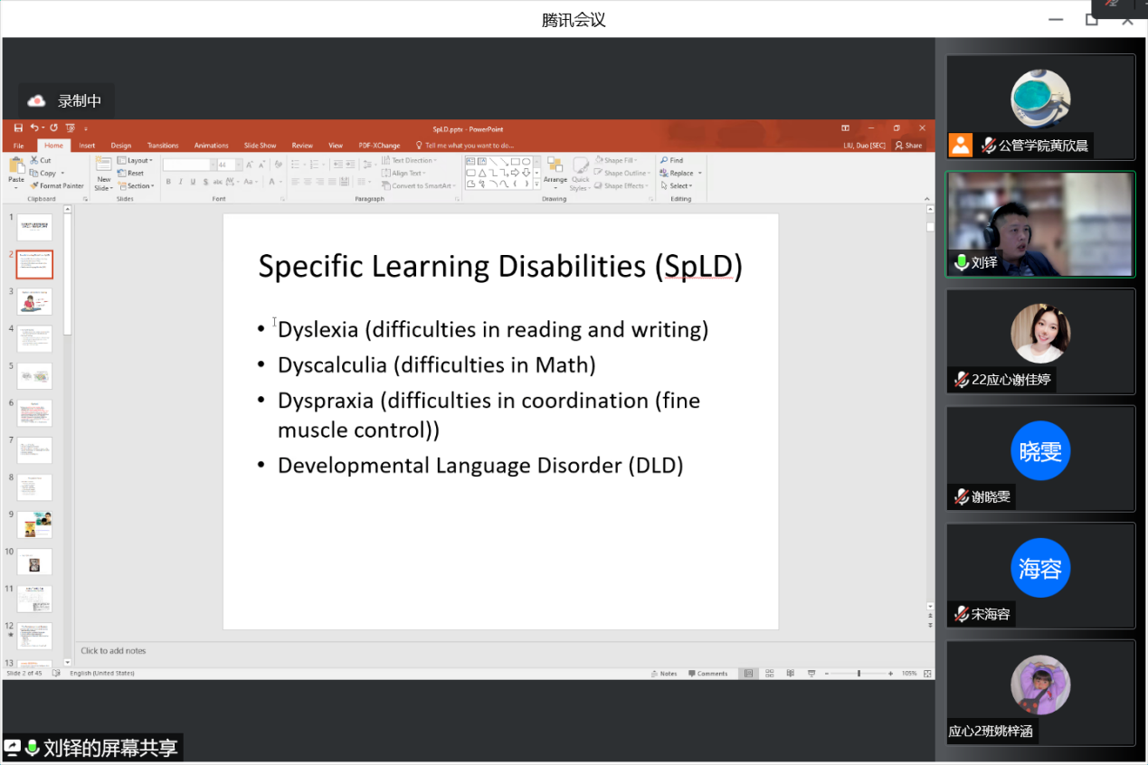 讲座伊始,刘铎副教授首先介绍了人类听、说、读、写的发展,之后再结合自身的研究内容生动的讲解了产生SpLD特殊学习障碍——读写障碍、特殊语言障碍、发展性协调障碍、特殊数学运算障碍的原因、相应的表现症状、发展特点、以及干预方法。过程中,刘铎副教授还穿插播放了电影《地球上的星星》的片段,让同学们更加直接地感受阅读障碍儿童的症状。讲座最后,刘铎副教授讲述了阅读障碍的发病率以及关注阅读障碍的重要性,呼吁多关注阅读障碍儿童的心理健康、给予他们更多的关注与爱。