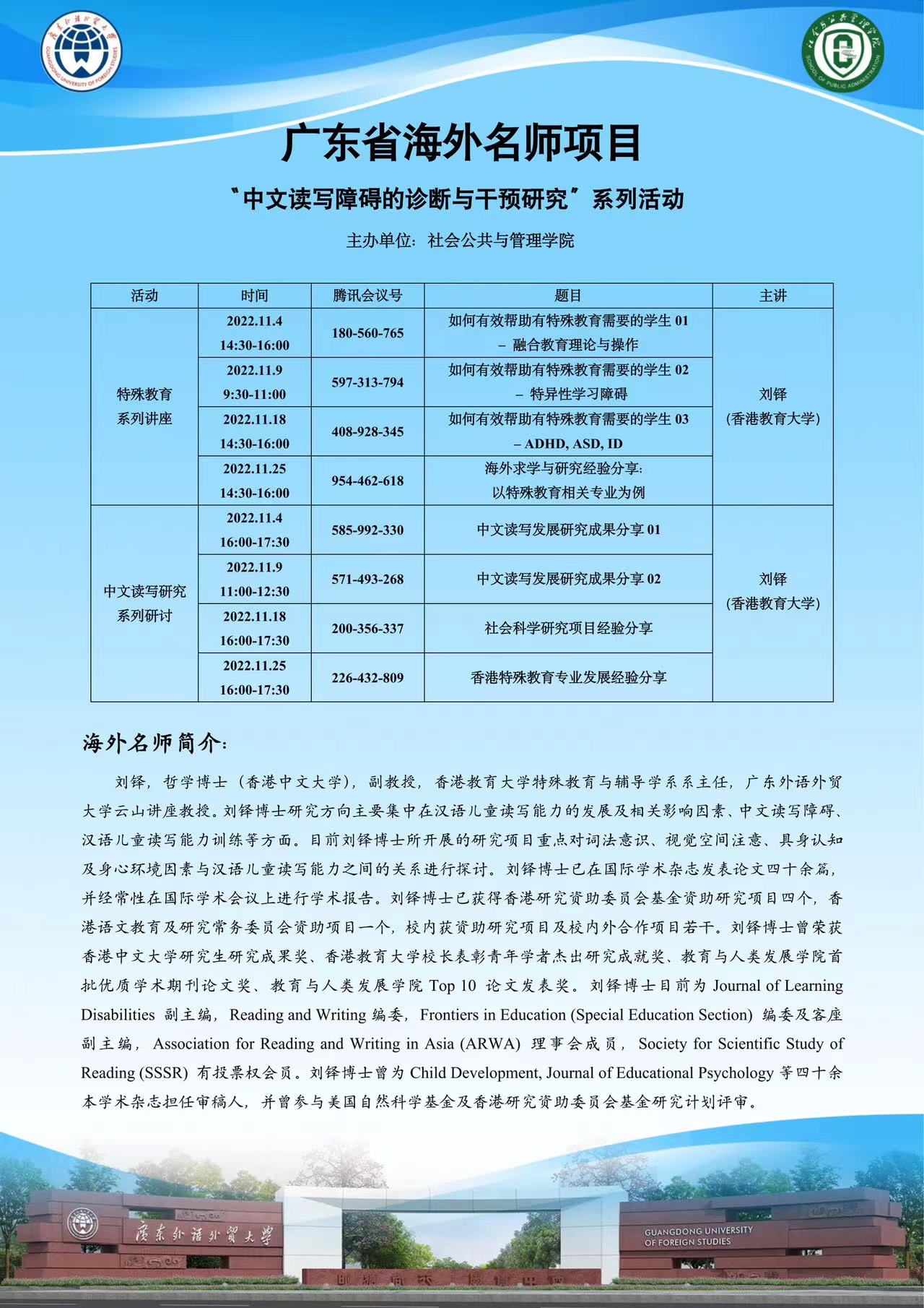 2022年11月25日,公管学院举办了以“海外求学与研究经验分享:以特殊教育相关专业为例“为主题的线上讲座。该讲座为广东省海外名师项目之特殊教育系列讲座最后一讲。