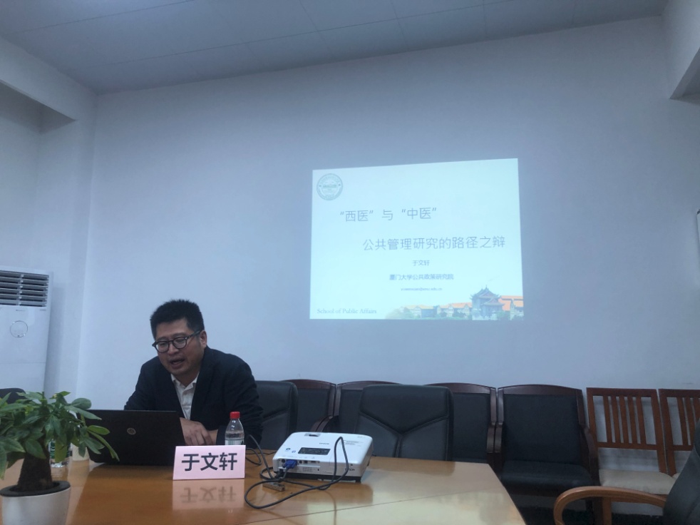 2021年4月15日晚上7:00,由公管学院与广东省社会组织研究中心联合举办的学术讲座“良政善治讲堂”第4讲在南校区教学楼D506会议室举行。本次讲座特邀厦门大学公共事务学院、公共政策研究院博导于文轩教授就“‘西医与中医’:公共管理学研究路径之辩”做主题讲座。公管学院党委书记高云坚、副院长涂斌、行政管理系主任费久浩、部分社会管理硕士生导师、公共管理大类老师以及50余名相关专业的硕士研究生和本科生参加本次讲座,讲座由涂斌副院长主持。