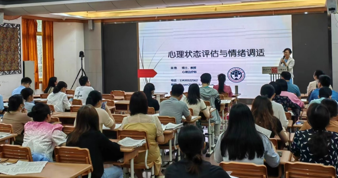 首先,吴艳面向南武中学高中部全体班主任开展了题为“心理状态评估与情绪调节”的心理讲座。讲座针对班主任如何识别学生们的身心健康状况与情绪,以理论结合实践的方式展开。