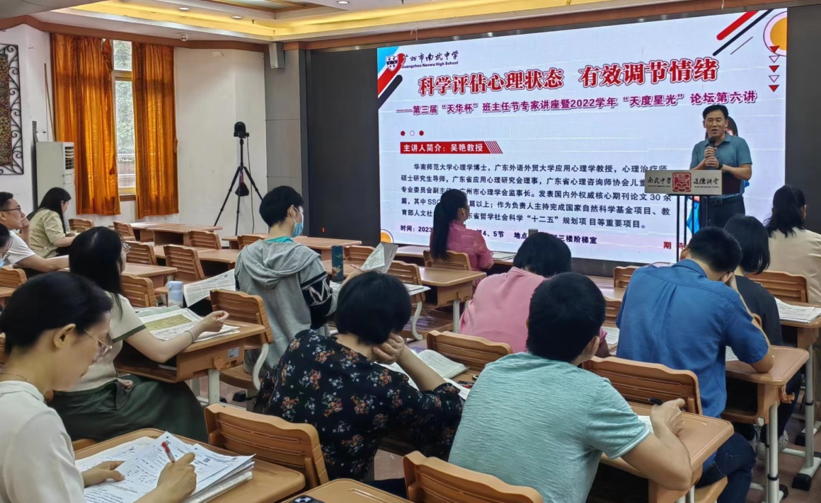 2023年5月17日,应用心理学系吴艳教授前往我校优质生源基地广州南武中学面向高中年级班主任和高三学生开展心理讲座,帮助教师掌握心理评估方法与技巧,教会学生掌握考前心理调节方法。