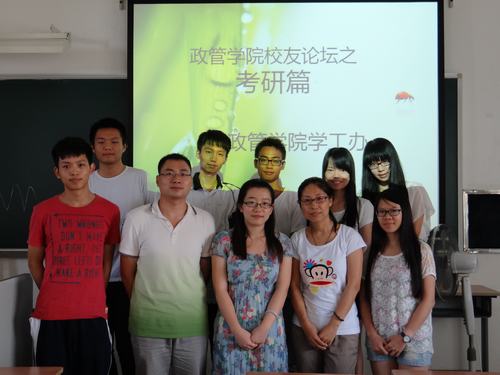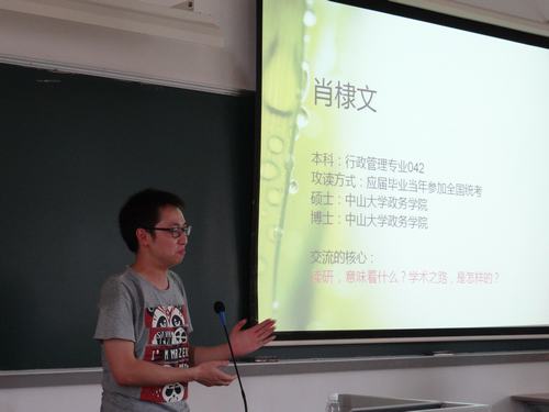 肖棣文同学是我院08年毕业的行政管理专业校友。他介绍了自己的读大学和读研及读博的经历。在讲到读研的原因时,他说自己大一时是一个很懒、成绩中等偏下的人。然而渐渐地,他发现在了隐藏在书本深处的奇幻世界、爱上了读书。在这期间,他开始对自己的学习感到不满足,从而下定了考研的决心。他铁了心去准备,并最终成功通过了考试。在他看来,考研这一条学术之路,非常辛苦,有过彷徨、有过崩溃,当然,也有成功的喜悦。他告诫大家,要慎重选择这条路,只有那些能静下心来去学习、能够踏踏实实去做学术的人才能坚持到最后。