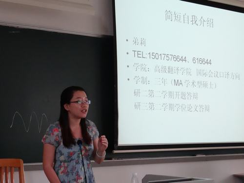 弟莉同学是2012年毕业的公共事业管理专业的校友。当年,她以学院绩点第一名的身份,通过了高翻学院口译专业的复试,获得了宝贵的保研名额。在讲到读研的感悟时,她告诫师弟师妹们,选择考研一定要慎重,除非你觉得自己离开这条路就没有办法生活。在她看来,一名合格研究生的生活是很辛苦的:“每天早上8点到晚上8点12个小时的翻译训练,很辛苦。如果是在工作岗位上也能这么付出的话,在职务和物质上可能比研究生毕业之后收获得还要多。”但是因为是自己发自内心喜欢的,所以还是会感觉很快乐。此外,她还向师弟师妹们推荐了一些学习英语的方法并提醒他们如果决定考研就尽早开始做准备,让读研之路赢在起跑线上。