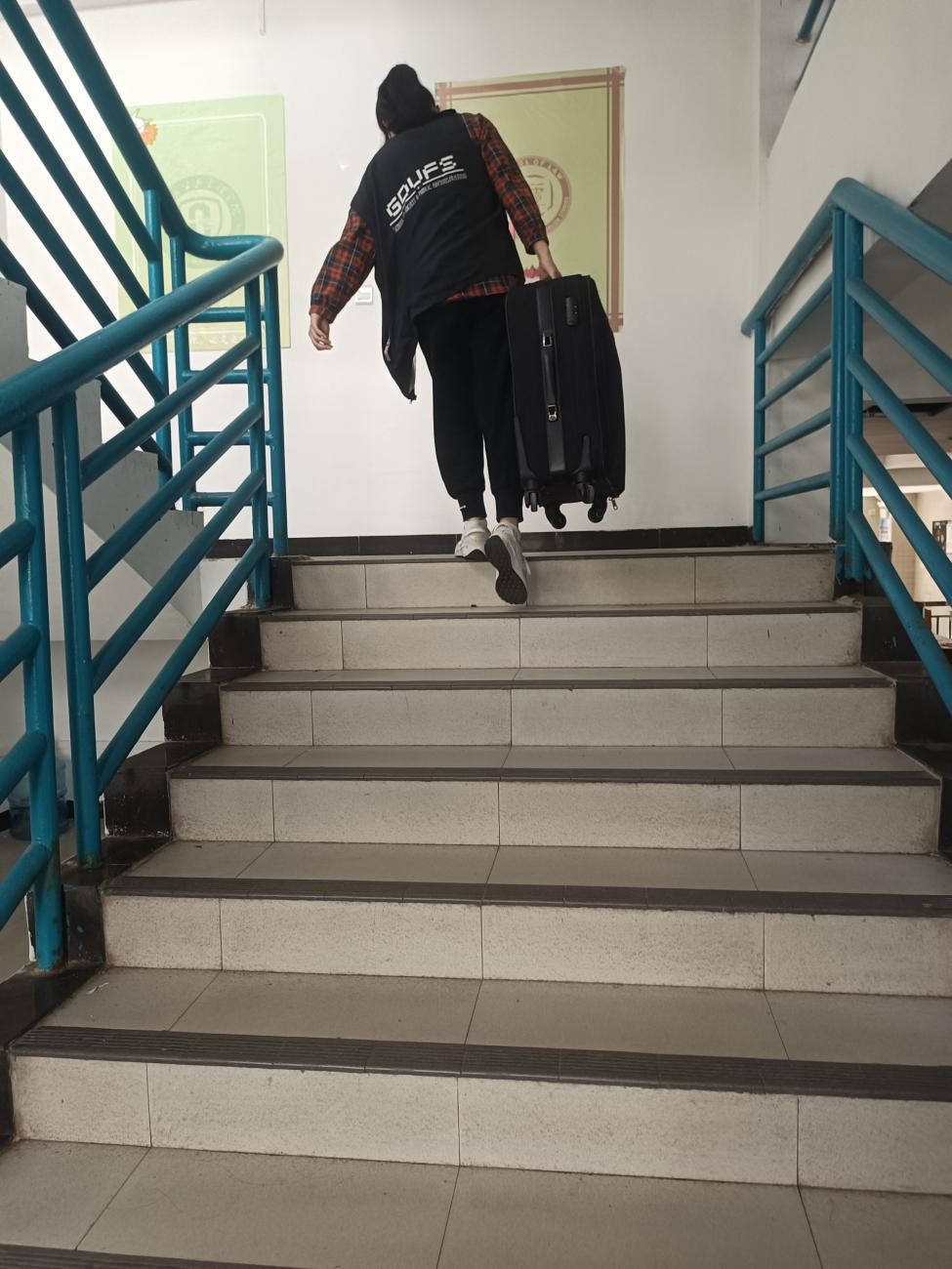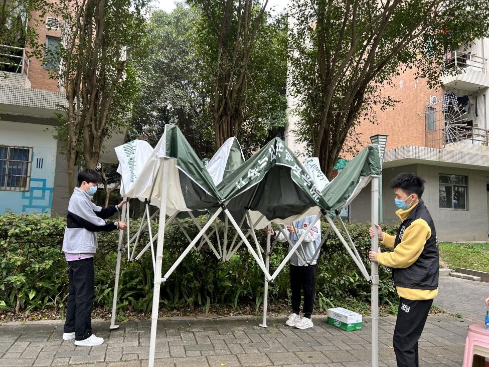 早上8时,负责帮忙搬运行李的志愿者们纷纷到岗。志愿者们在校道旁挂上公管学院的欢迎横幅,等待同学们的返校。