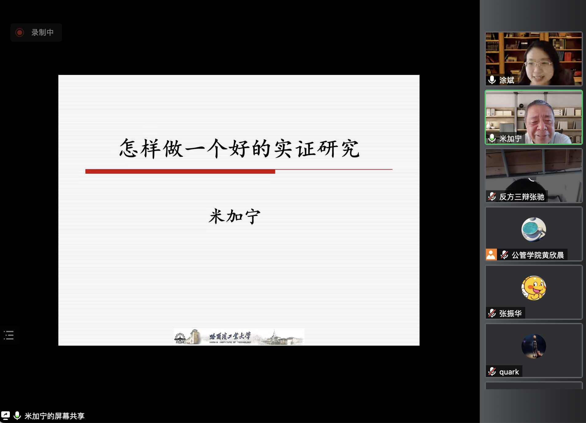 本网讯 2022年12月9日下午,我校举办了以“怎样做一个好的实证研究”为主题的著名教授论坛第574讲。本次论坛由我校人力资源部(教师发展中心)主办,社会与公共管理学院承办,特邀全国公共管理专业学位(MPA)教指委委员、哈尔滨工业大学管理学院米加宁教授主讲。本次论坛采取腾讯会议线上方式召开,学校两百余名师生参加了此次论坛,论坛由公管学院院长涂斌主持。